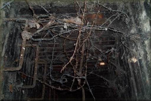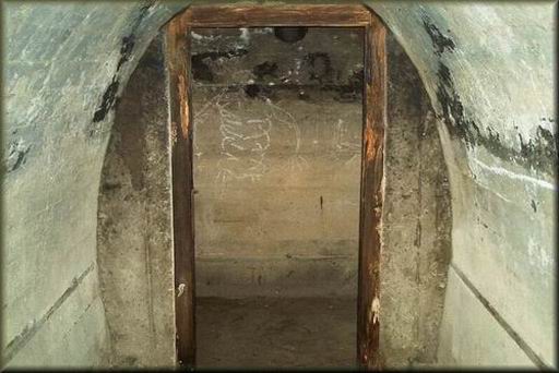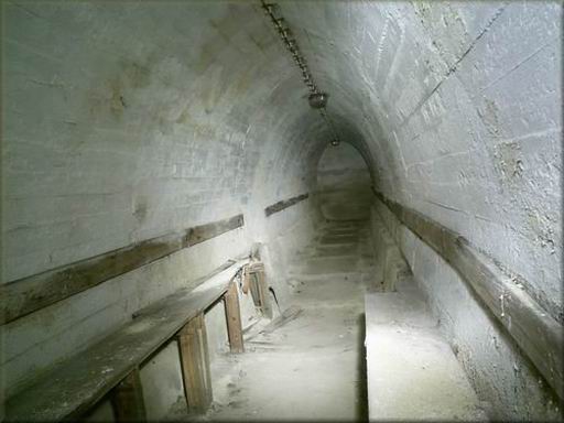 Uvnitř je jedna dlouhá chodba s nápisy RUHE a KLID. Na stěnách jsou saze. U paty stěny jsou betonové konzoly pro umístění dřevěných lavic. Odbočka ke vchodu s propadlou klenbou je zasypána odpadky.