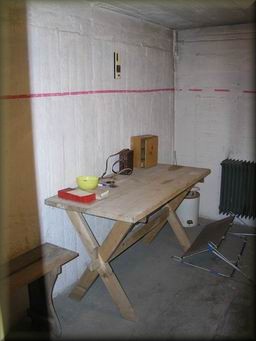 V krytu jsou po stěnách rozmístěny rozmanité vlhkoměry, tlakoměry a teploměry. Přístroj na následující fotografii je tzv. diferenciální tlakoměr, užitý ve funkci průtokoměru. Pod ním bude instalován v potrubí nějaký měřící element (dýza nebo clona). Podle kolečka škrtícího ventilu, údajů na tabulkách a tenkých trubek sloužil nejsíš k dávkování přesného množství kyslíku z lahví. Patrně byla tedy vzduchotechnika (krom filtrace vzduchu nasávaného z venčí) schopná pracovat i zcela odděleně - tj. s kyslíkem z lahví a pohlcováním vydechnutého oxidu uhličitého do kartuší s granulemi hydroxidu sodného).
