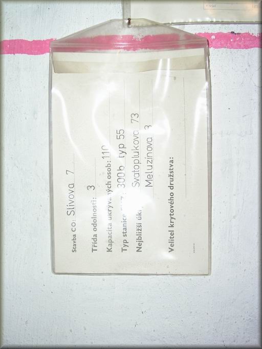 Ulice Slívova Zástavba v navštíveném území pochází z období 50.-60. let. Kryty zde byly budovány buď jako protiradiační úkryty (upravené sklepní prostory, maximální třída odolnosti 3) nebo stálé tlakově odolné úkryty STOÚ (kryty v pravém slova smyslu, třída odolnosti 3-5). Tento kryt měl mít kapacitu 110 osob a třídu odolnosti 3. Vstup do krytu vede přes protiplynovou předsíň a sprchovou část (dekontaminace). Nouzový výlez vede do zahrady za domem a je zajištěn - vyskytly se případy průniku zvenčí.