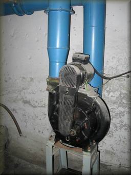 Vchodové protitlakové dveře a potrubí ventilačního systému s vyrovnávacími klapkami.
